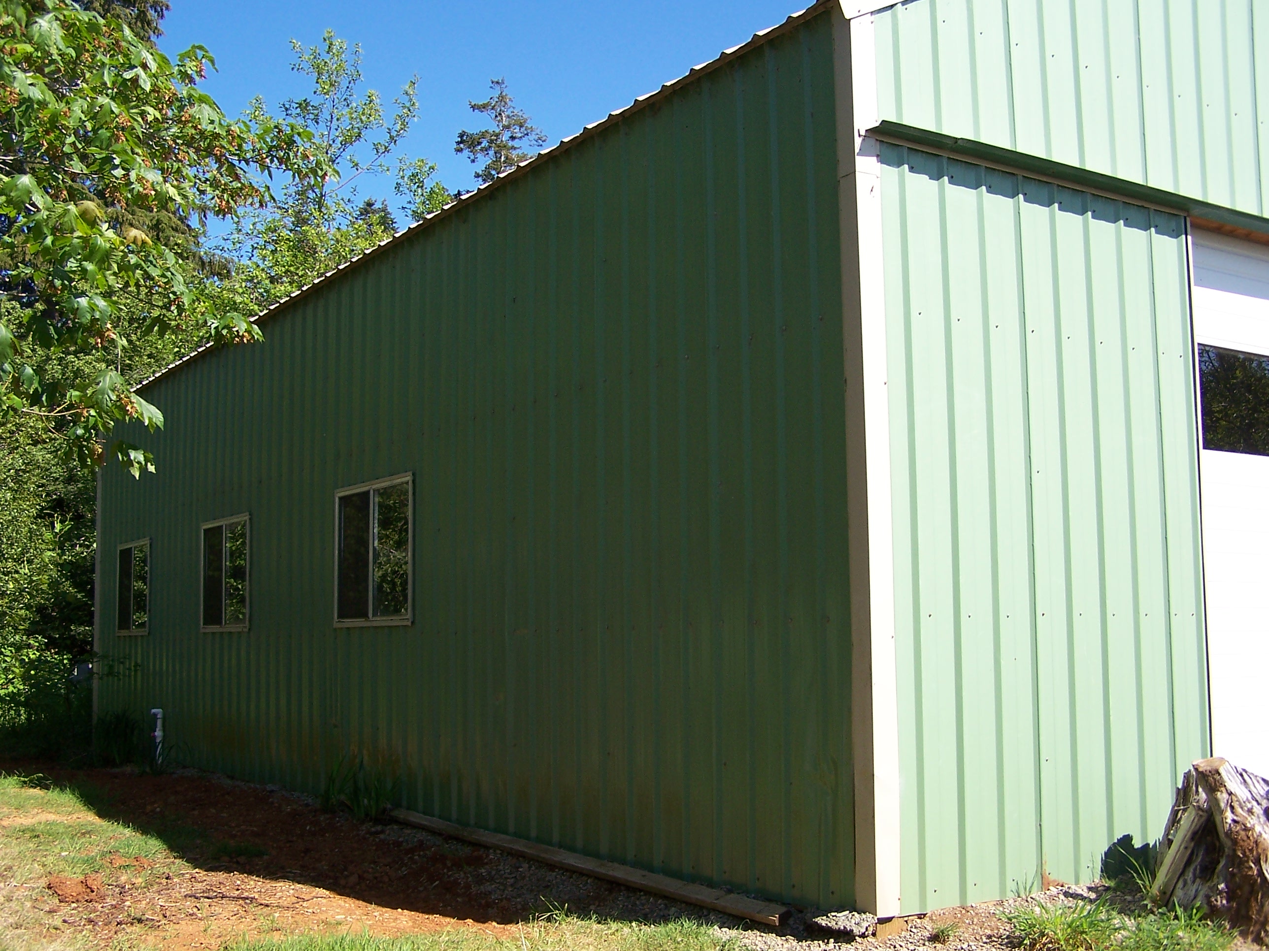 Windows on all sides of the shop / garage offers natural lighting and ventilation. Metal siding and roof.
